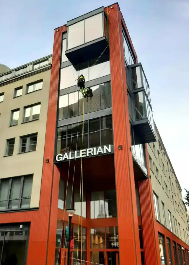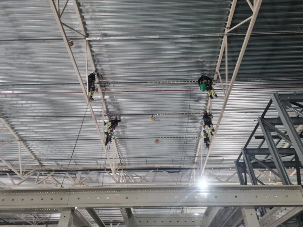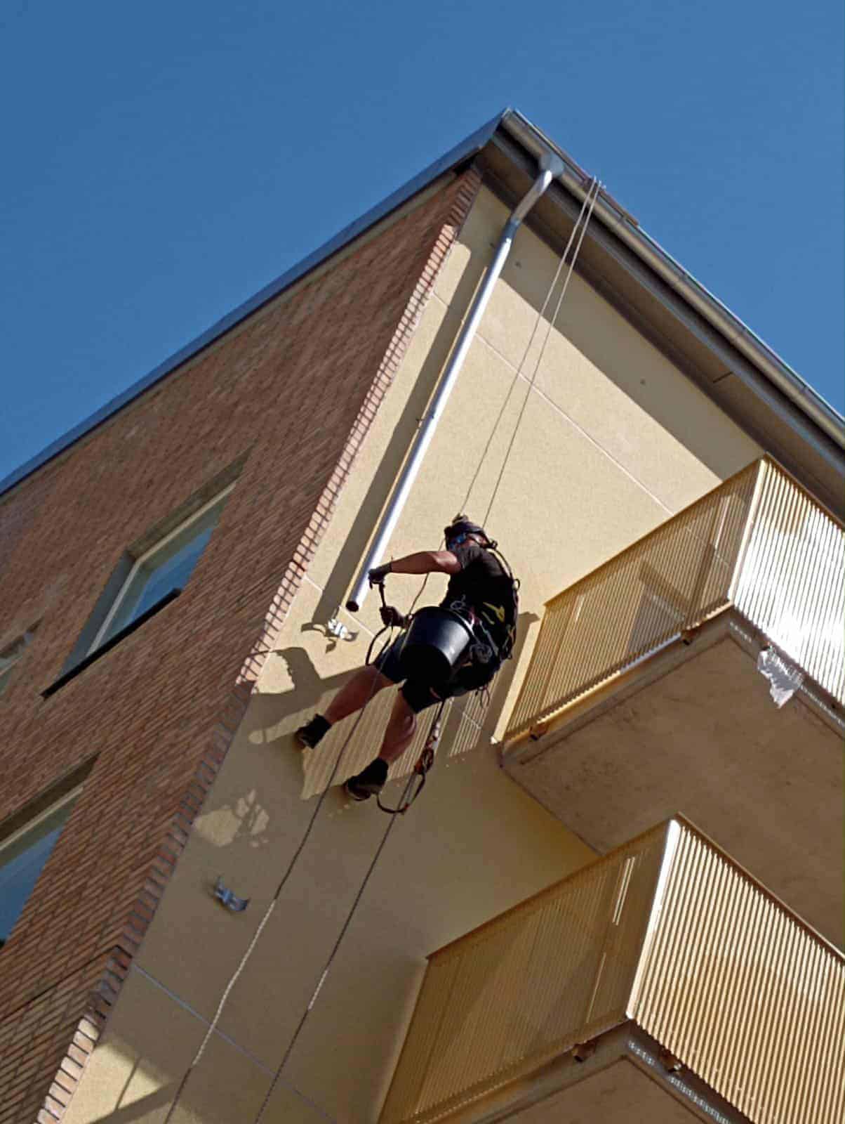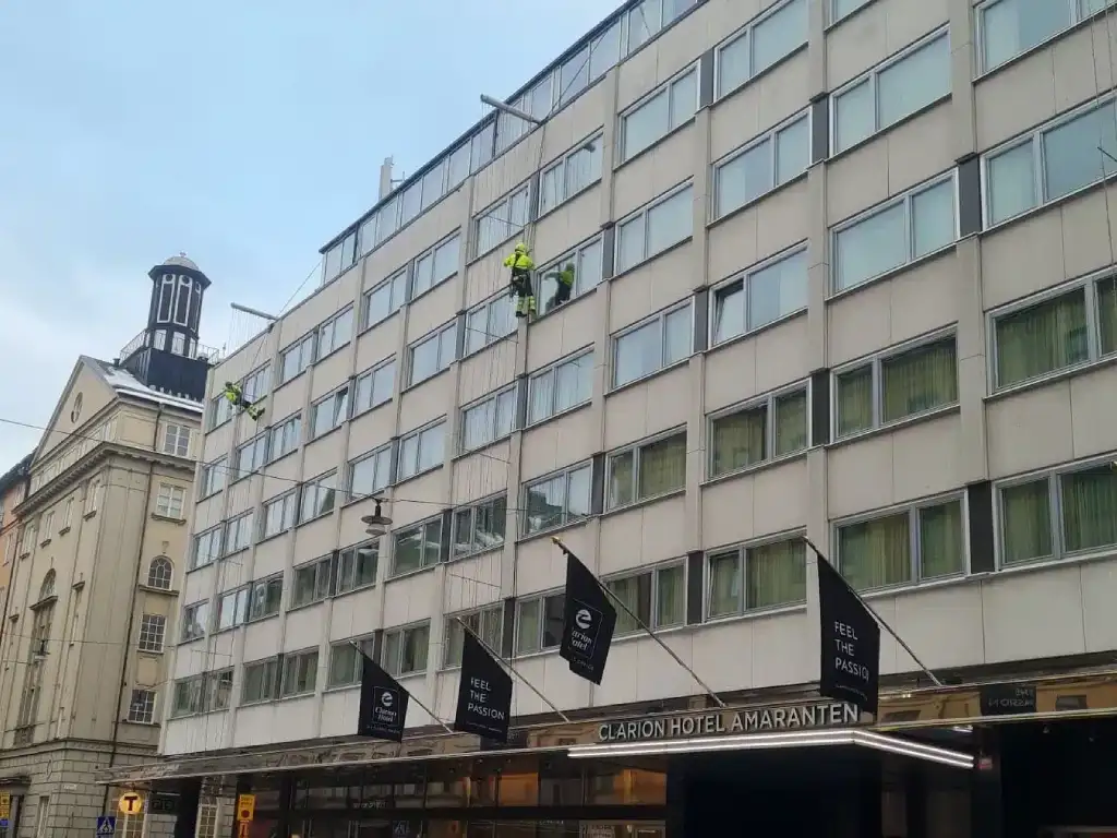 Arbetet utförs direkt via klättring, vilket innebär färre liftar, mindre avgaser och en tryggare arbetsmiljö. Samtidigt kan övrig personal fortsätta sina uppgifter ostört. Vi avspärrar endast den riskzon som behövs under pågående arbete och flyttar avspärrningarna i takt med att projektet fortskrider.
