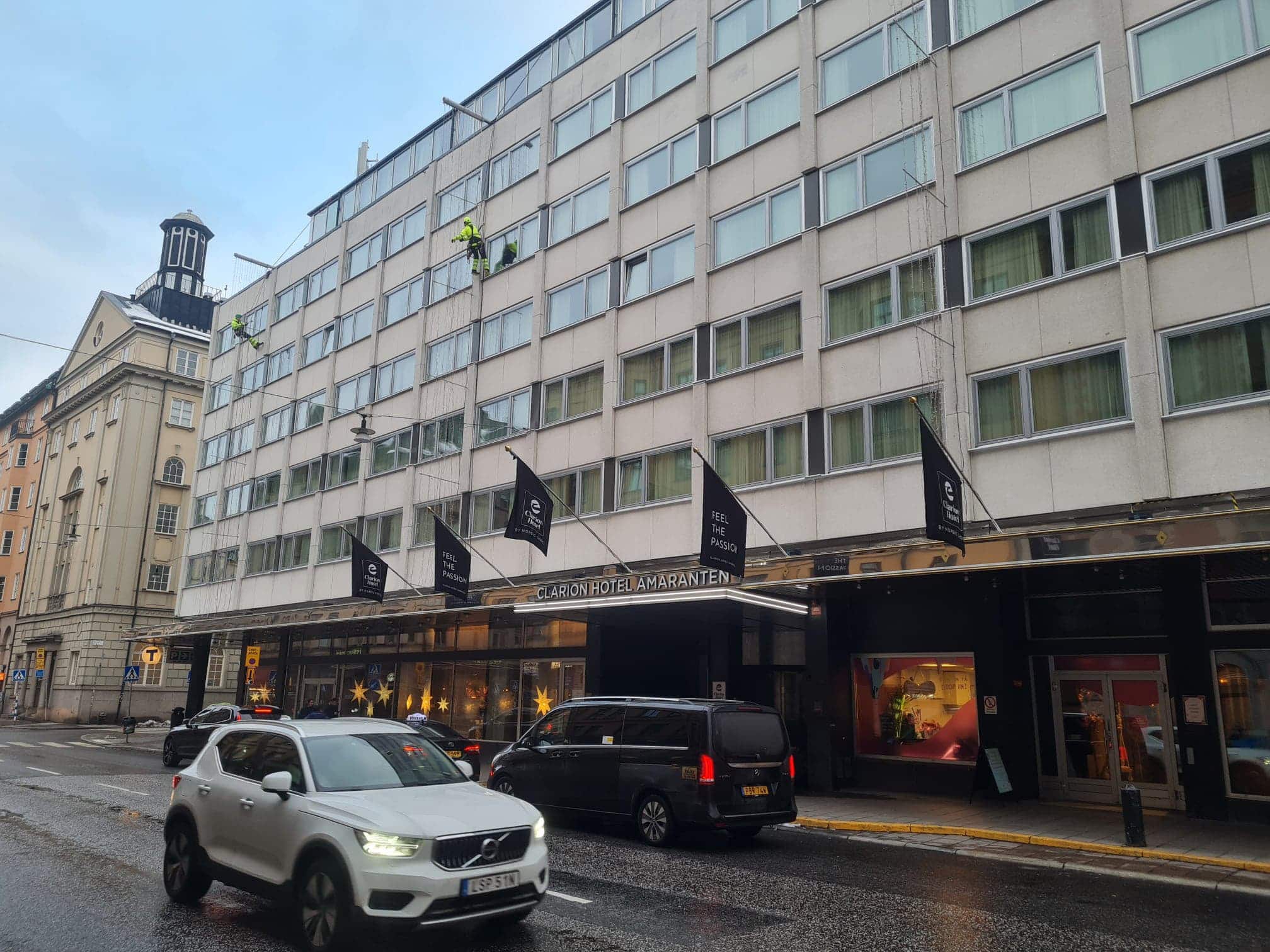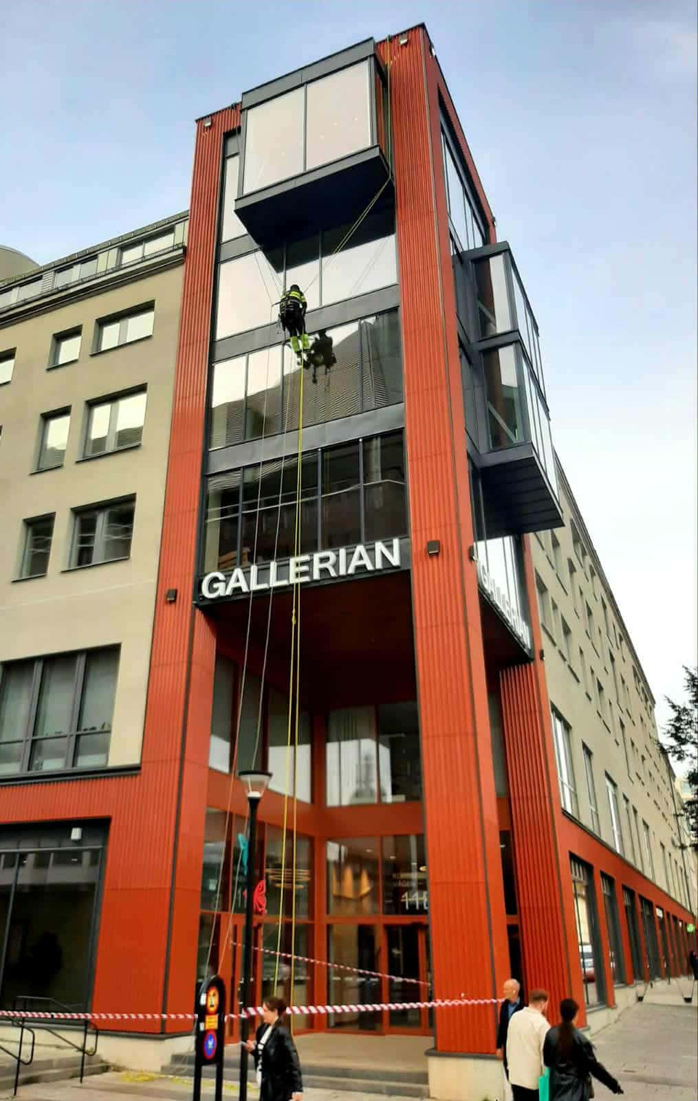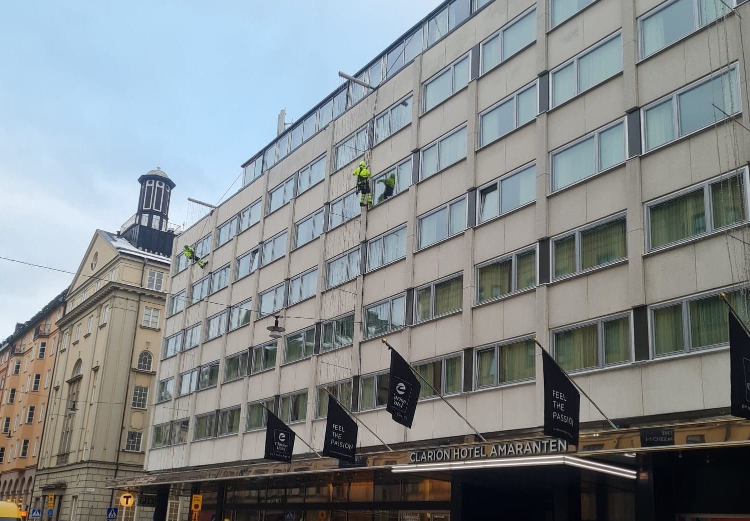 Arbetet utförs direkt via klättring, vilket innebär färre liftar, mindre avgaser och en tryggare arbetsmiljö. Samtidigt kan övrig personal fortsätta sina uppgifter ostört. Vi avspärrar endast den riskzon som behövs under pågående arbete och flyttar avspärrningarna i takt med att projektet fortskrider.